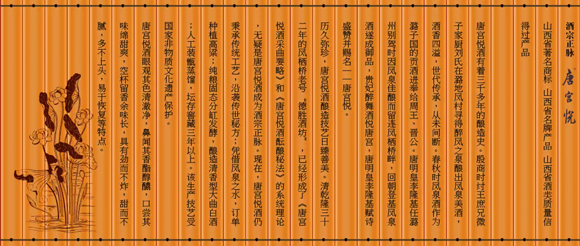 鳳棲橋釀業(yè)有限公司歷史悠久。從殷商微子家廚劉氏尋鳳泉釀酒至今,已有三千多年釀造史。劉氏后裔代傳代善, 才有唐明皇李隆基賜名“唐宮悅”,到清乾隆三十二年的鳳棲橋老號“德勝酒坊”已形成了《唐宮悅酒采曲要略》和《唐宮悅酒醞釀秘法》的系統(tǒng)理論的系統(tǒng)理論,直至建國初期的一九五二年才被當時的潞城邊區(qū)酒坊所接管,一九七四年改邊區(qū)酒坊成立國營潞城縣酒廠,二00六年改制為現公司公司地處晉冀豫三省通衢素有“商賈云集旱馬頭”美譽的微子古鎮(zhèn)……【詳細